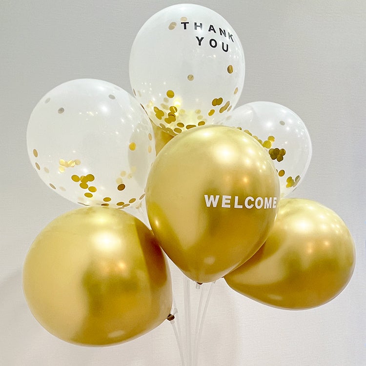 輝くゴールドとコンフェッティのバルーンは、ゲストの目を惹くパーティーアイテム。