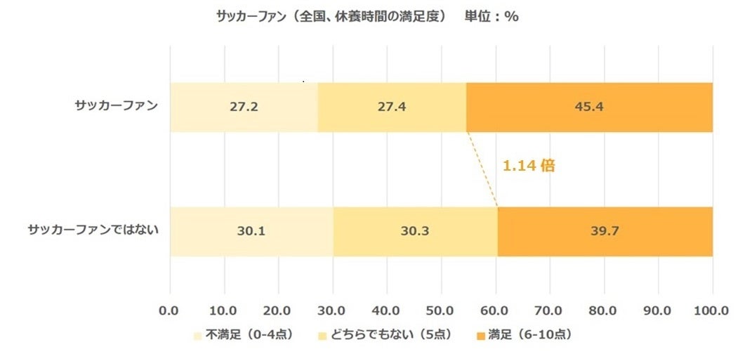 サッカーファンの休養満足度はそうでない人に比べ、1.14 倍という結果に。また種別で見ると唯一、45%を割ったのが海外サッカーリーグでしたが、海外サッカーは時差により放映時間が深夜や早朝などになり、その要因で比率が下がっていることが推測されます。