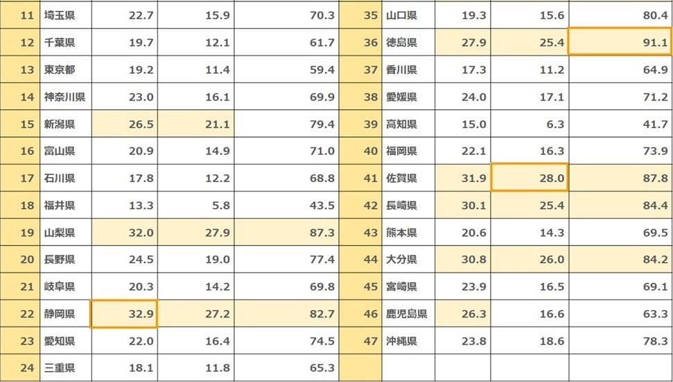 全国都道府県別でサッカーファン率が高い都道府県1位は、静岡県(静岡県はサッカー行動頻度でもNo.1※)。次いで2位山梨県、3位佐賀県がランクインしました。また、プロサッカーリーグファン率1位は佐賀県、2位山梨県、3位静岡県となりました。