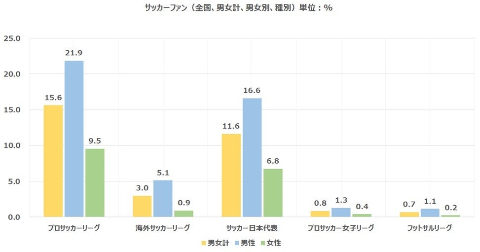サッカーファンの各種(プロサッカーリーグ、海外サッカーリーグ、サッカー日本代表、プロサッカー女子リーグ、フットサルリーグ)においては、どの種別においても男性比率が高く、なかでもプロサッカーリーグは21.9%と高い割合を占めていました。