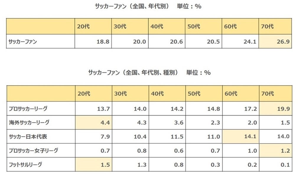 サッカーファン層は70代、20代30代は海外趣向が多い結果に