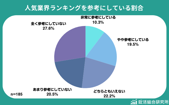一方、就活生の29.8%が人気業界ランキングを参考にしているものの、48.1%はランキングをほとんど参考にしていないことも分かりました。