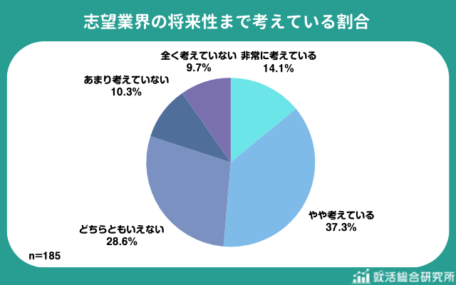 志望業界の将来性まで「非常に考えている」(14.1%)、「やや考えている」(37.3%)と答えた就活生はあわせて51.4%でした。半数以上が業界の未来性を意識して企業選びを行っており、短期的な条件だけでなく長期的な成長性や安定性を重視する姿勢がうかがえます。