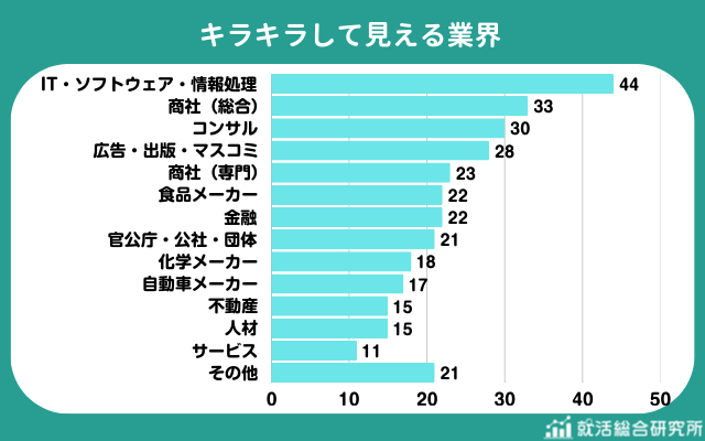 キラキラして見える業界としても、「IT・ソフトウェア・情報処理」(44人)が最多となりました。