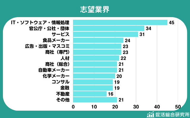 就職したい業界としては、「IT・ソフトウェア・情報処理」(45人)が最多でした。