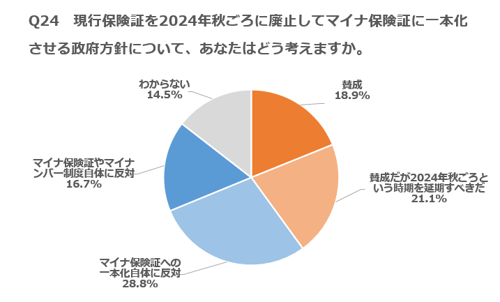 2024年秋ごろに現行の健康保険証を廃止してマイナ保険証に一本化することに関し「マイナ保険証への一本化自体に反対」が28.8%、「賛成だが時期を延期すべきだ」が21.1%、「賛成」18.9%、「マイナ保険証やマイナンバー制度自体に反対」16.7%となった。(Q24)