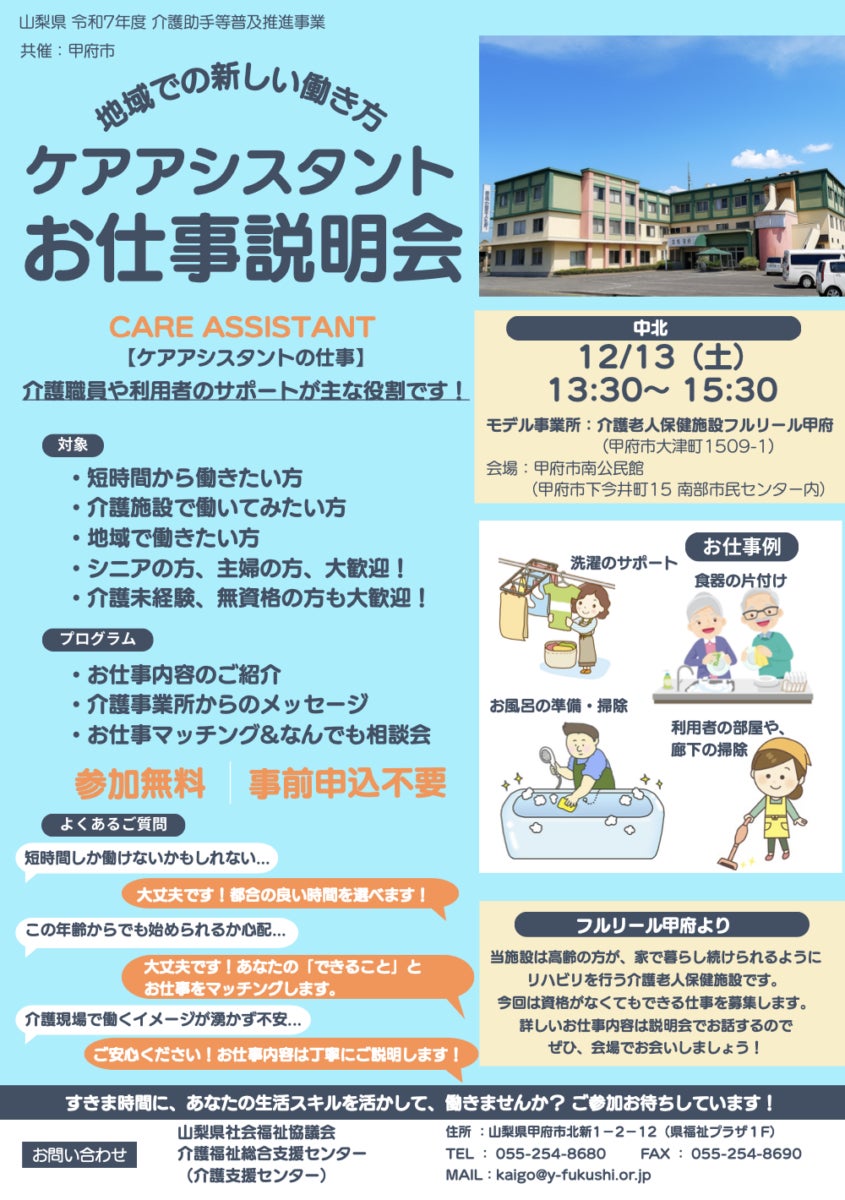 山梨県の委託を受けた山梨県社会福祉協議会が主導する本事業は、介護人材の確保・定着、介護の質の確保、多様な人材の介護現場への参加を促進するため、介護助手の普及促進を行う事業です。