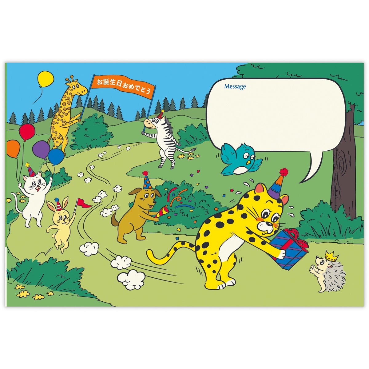ペンギン、くま、リスなど動物たちが住むキュートなケーキのおうちを表現した、ドールハウスのように立てて飾れるお子さま向けオルゴールカード。動物たちのお祝いボイスに加え、LEDライトが光って特別感たっぷり。