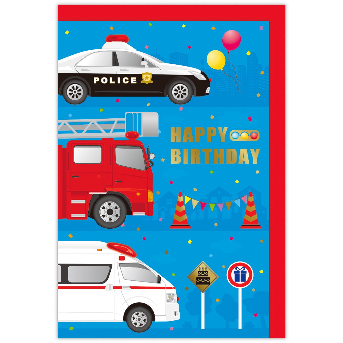 お子さまに人気のパトカー・救急車・消防車をモチーフにしたオルゴールカード。リアルなイラストとサイレン音、光るライトなど細部までこだわりが詰まっています。消防車のはしごは引っ張ると伸びる仕掛け付き。中面にはプレゼントを持った人の標識も…!?