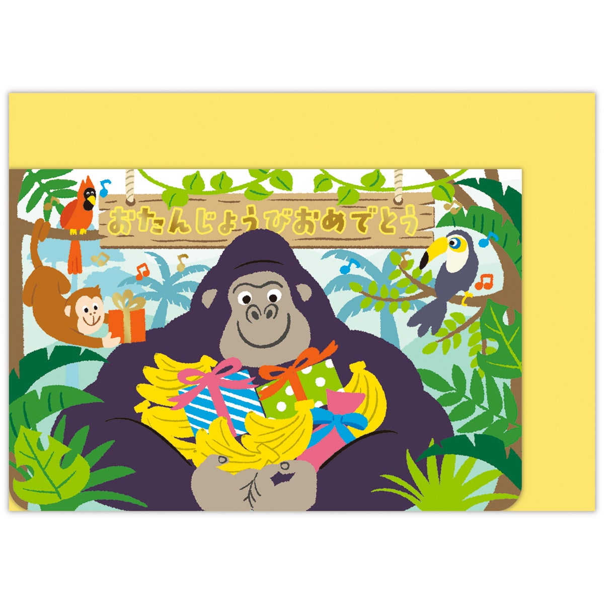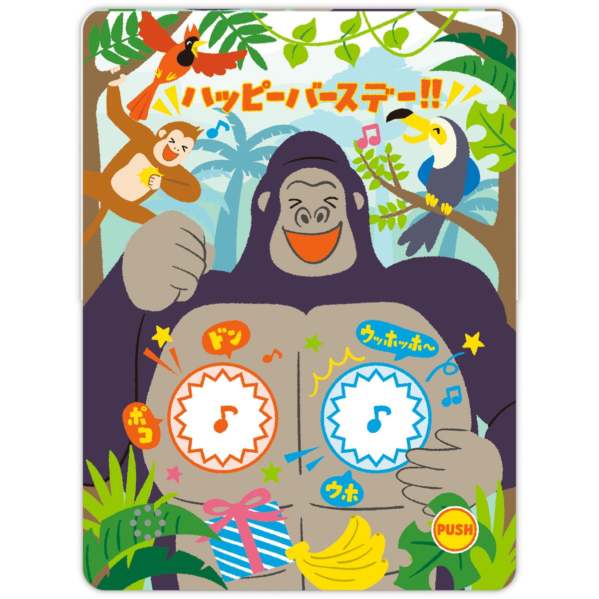 ゴリラの鳴き声やドラミングの音など、複数のサウンドが楽しめるインパクト抜群のオルゴールカード。リアルさと可愛さをミックスしたタッチでゴリラを描きました。おとぼけ感のある親しみやすいボイスがポイントです。