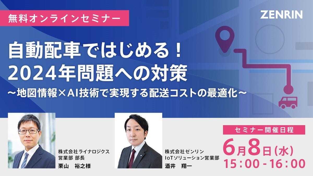 株式会社ゼンリン(本社:福岡県北九州市、代表取締役社長:髙山善司、以下ゼンリン)は2022年6月8日(水)15時より、「自動配車ではじめる!2024年問題への対策セミナー」と題してオンラインセミナーを開催します。