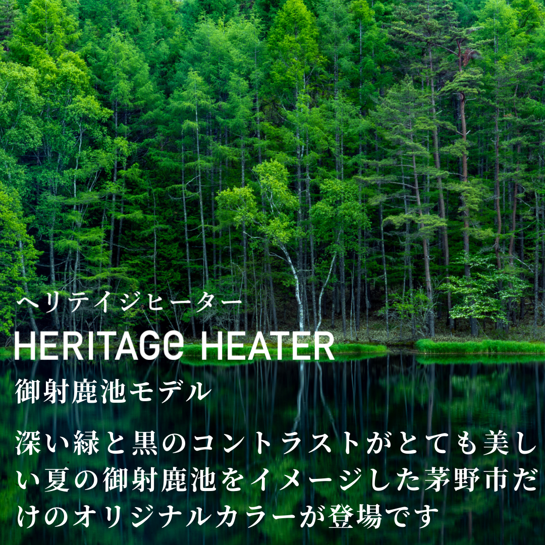 そんな御射鹿池の夏の深い緑と黒のコントラストをイメージし、ヘリテイジヒーターの特長である、天面のグリル部に新しい色を採用した茅野市だけのオリジナルモデルになります。