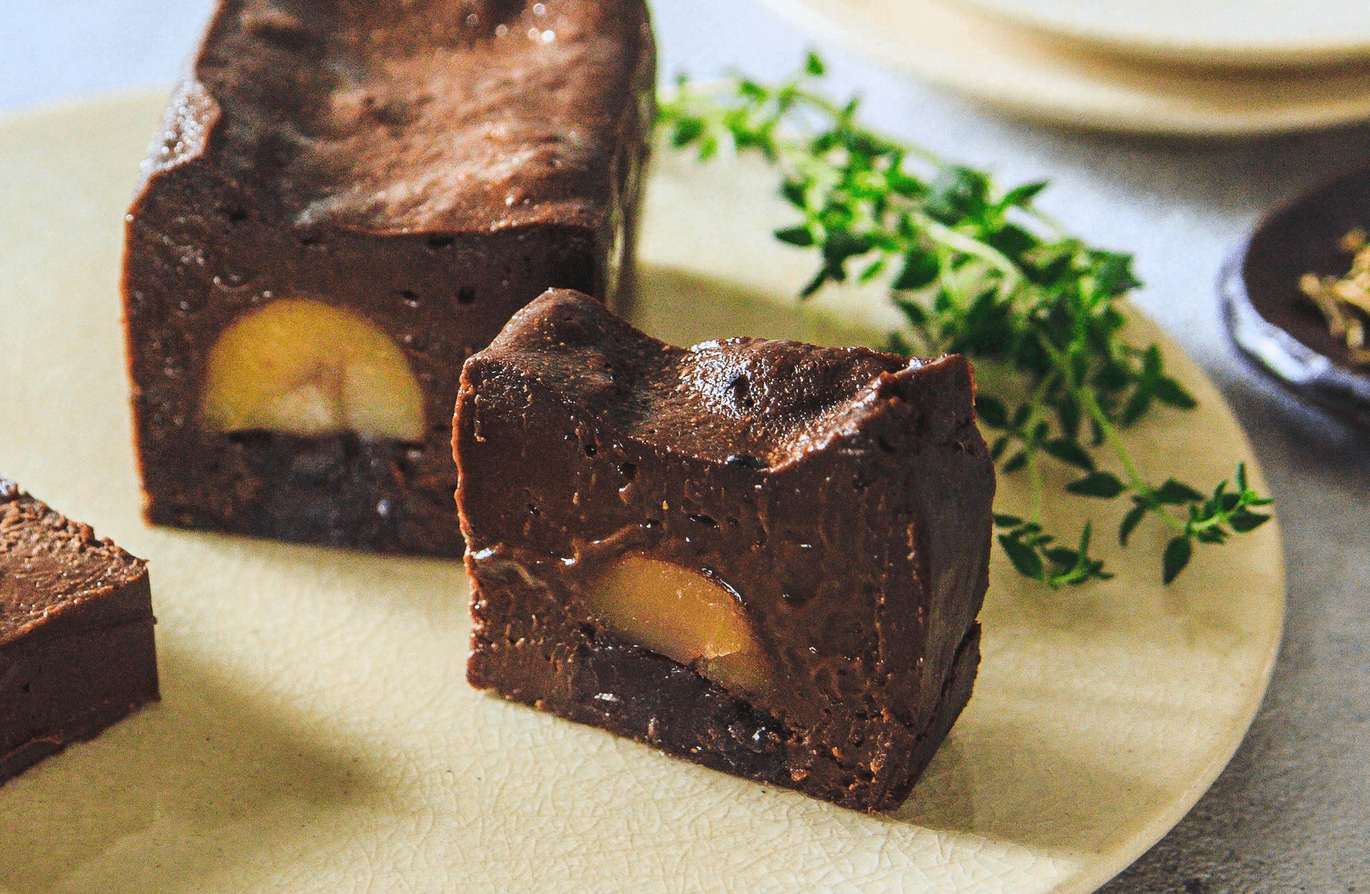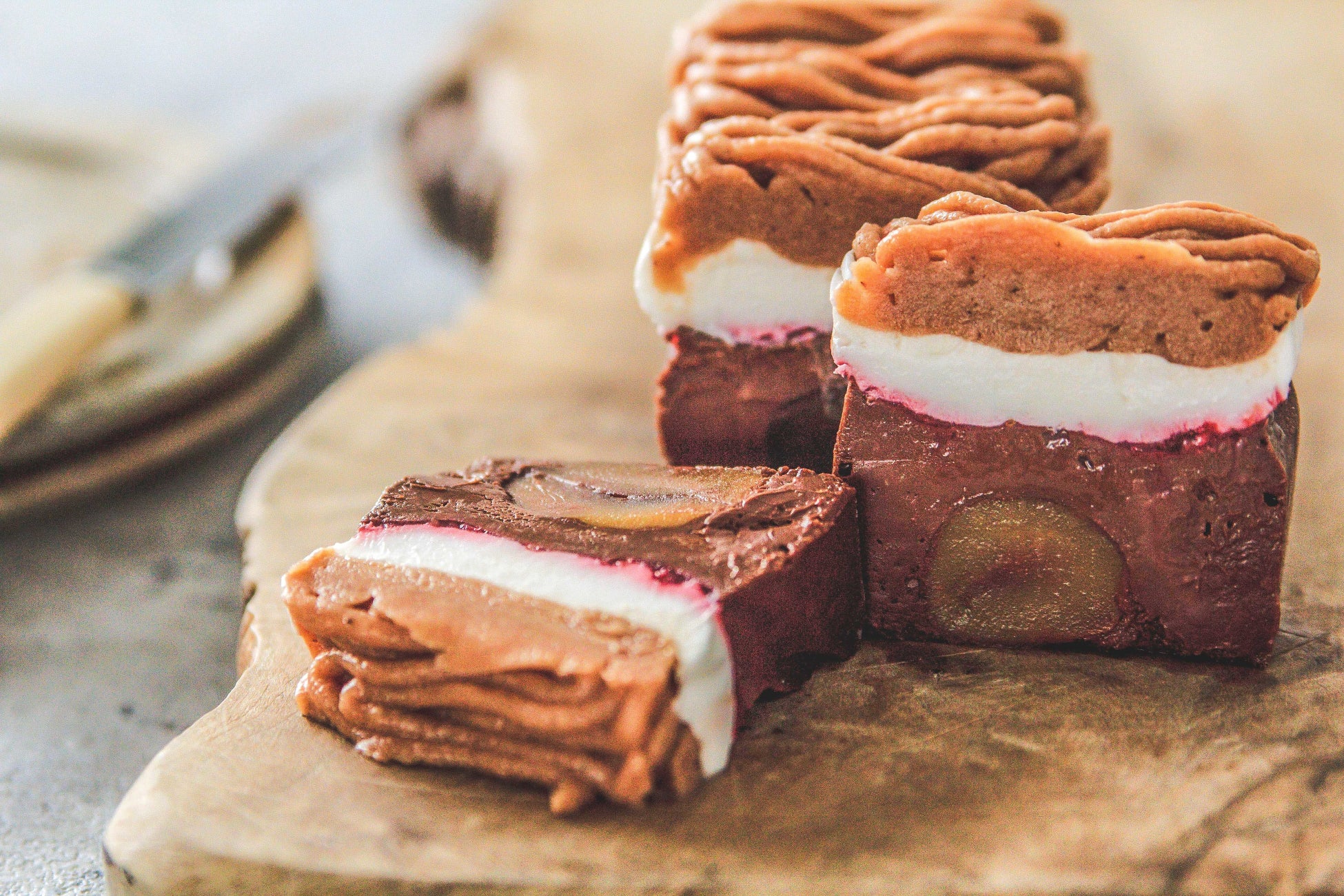3.中心には熊本産の栗の渋皮煮をゴロっと入れ、ひと口ごとに栗と生ガトーショコラをトータルに味わえるように。