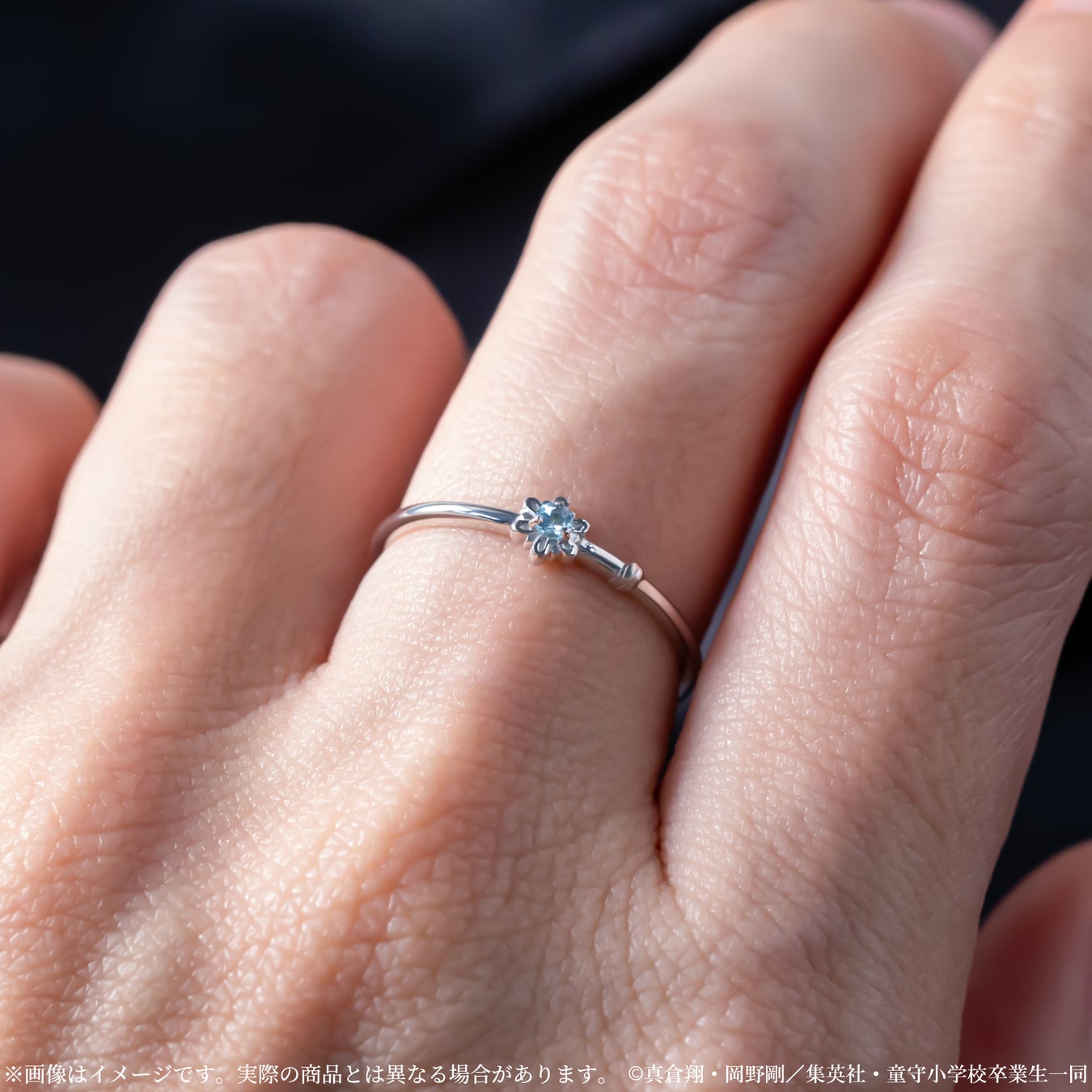 ゆきめの装いから着想を得たリングです。北国の山で育ったゆきめのイメージに合わせて帯留めや帯締めには雪の結晶モチーフを添えています。中央にセットしたブルートパーズが、季節外れの雪を降らせるほどの冷気を想起させます。