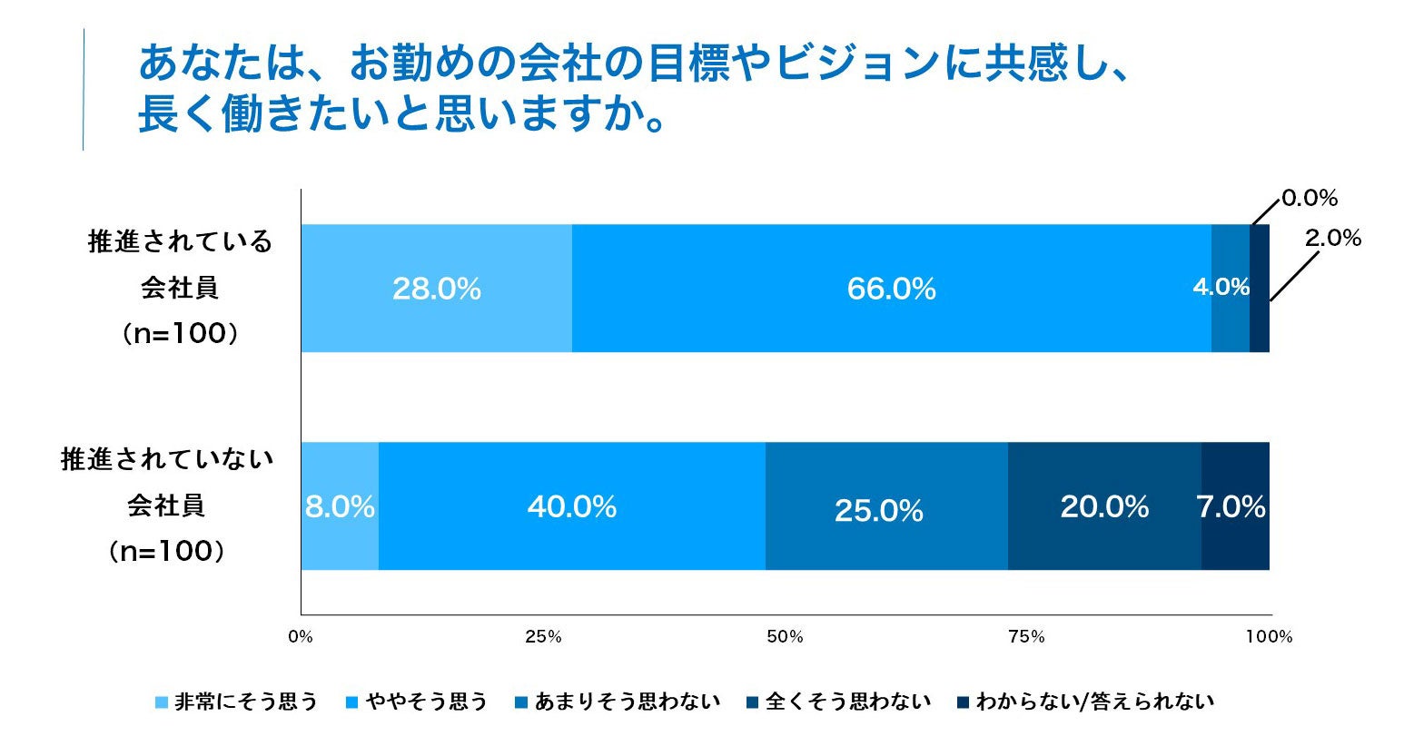 「Q2.あなたは、お勤めの会社の目標やビジョンに共感し、長く働きたいと思いますか。」と質問したところ、推進されている会社員は「非常にそう思う」が28.0%、「ややそう思う」が66.0%、推進されていない会社員は「非常にそう思う」が8.0%、「ややそう思う」が40.0%という回答となりました。「あまりそう思わない」が25.0%、「全くそう思わない」が20.0%で、合計45%と半数近くが「そう思わない」と回答しました。