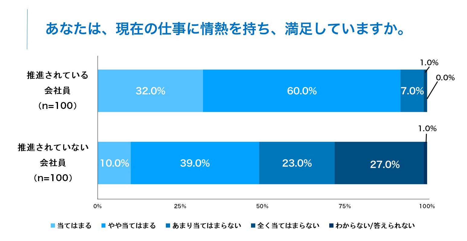 「Q1.あなたは、現在の仕事に情熱を持ち、満足していますか。」と質問したところ、推進されている会社員は「当てはまる」が32.0%、「やや当てはまる」が60.0%、推進されていない企業の社員の回答は、「当てはまる」が10.0%、「やや当てはまる」が39.0%、「あまり当てはまらない」が23.0%、「全く当てはまらない」が27.0%で、合計50%と半数が「当てはまらない」と回答しました。
