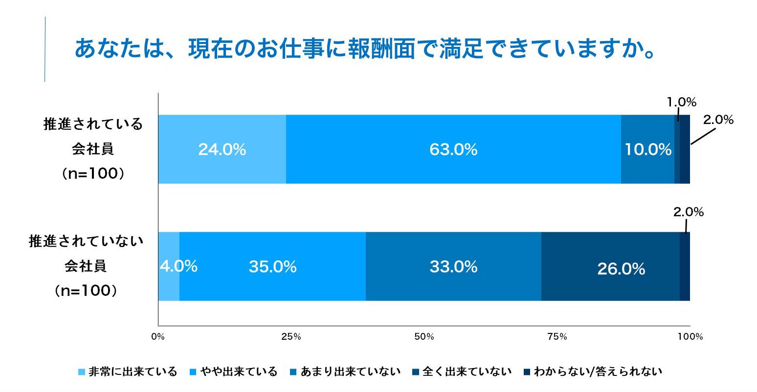 「Q8.あなたは、現在のお仕事に報酬面で満足できていますか。」と質問したところ、推進されている会社員は「非常に出来ている」が24.0%、「やや出来ている」が63.0%、推進されていない会社員は「非常に出来ている」が4.0%、「やや出来ている」が35.0%という回答となりました。「あまり出来ていない」が33.0%、「全く出来ていない」が26.0%で、合計59%と半数以上が「出来ていない」と回答しました。