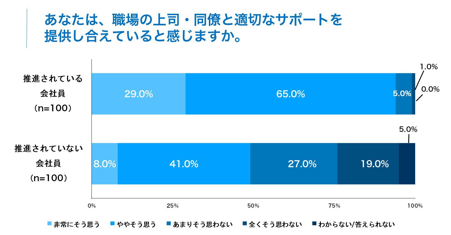 「Q3.あなたは、職場の上司・同僚と適切なサポートを提供し合えていると感じますか。」と質問したところ、推進されている会社員は「非常にそう思う」が29.0%、「ややそう思う」が65.0%、推進されていない会社員は「非常にそう思う」が8.0%、「ややそう思う」が41.0%という回答となりました。「あまりそう思わない」が27.0%、「全くそう思わない」が19.0%で、合計46%と半数近くが「そう思わない」と回答しました。