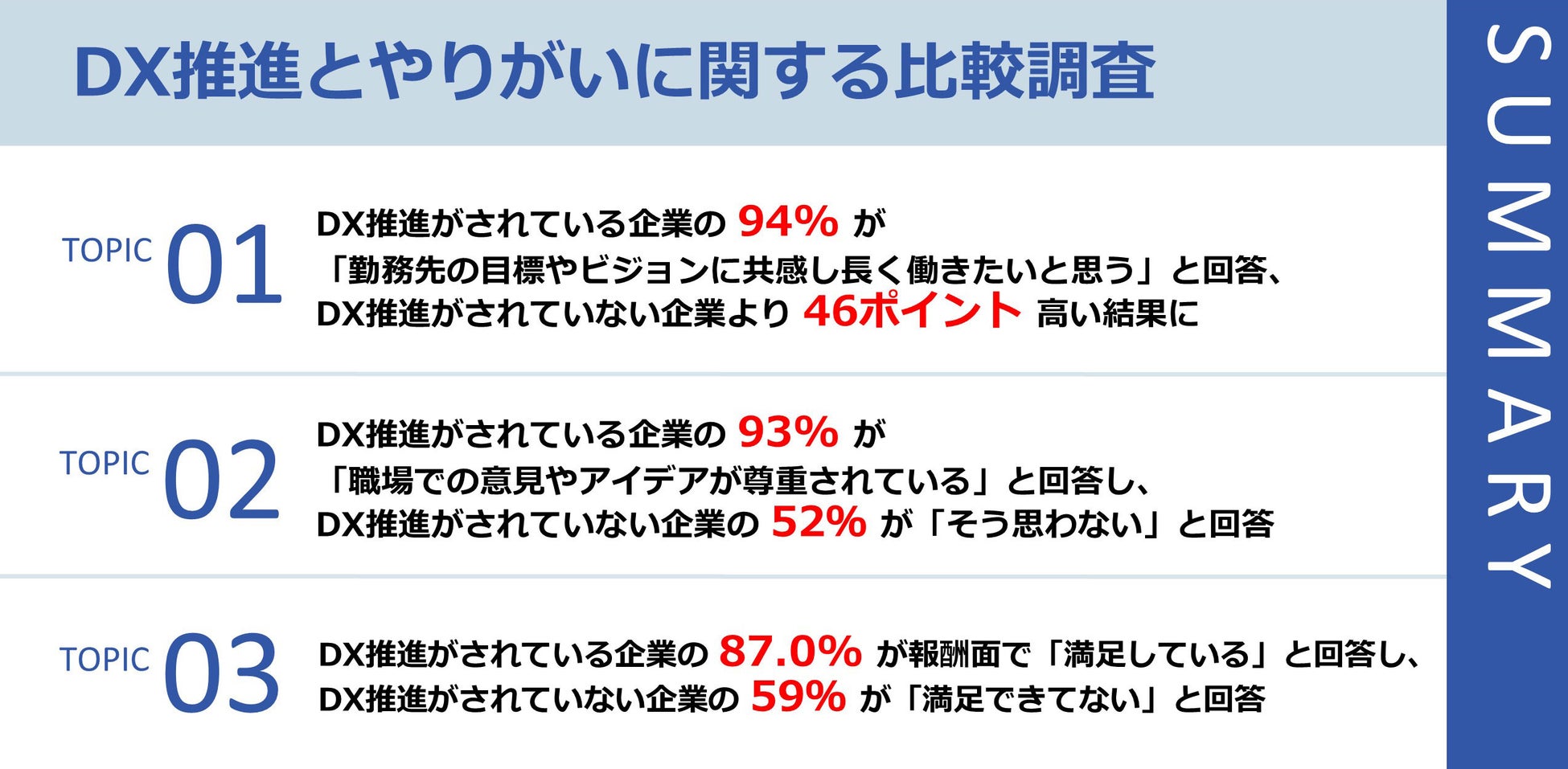 今回の調査では、DX推進が社員のやりがいや職場環境に、好影響を与えていることが明らかになりました。現場で働く社員にとって、DXが仕事への情熱や報酬満足度、職場でのサポート体制に関して、ポジティブな変化をもたらしている点が注目されます。現代のビジネス環境では、業務効率化だけでなく、社員のエンゲージメントや働きやすさが重要視されています。DX推進がそれらを実現する一助となるため、経営者は積極的にDX推進を検討すべきでしょう。