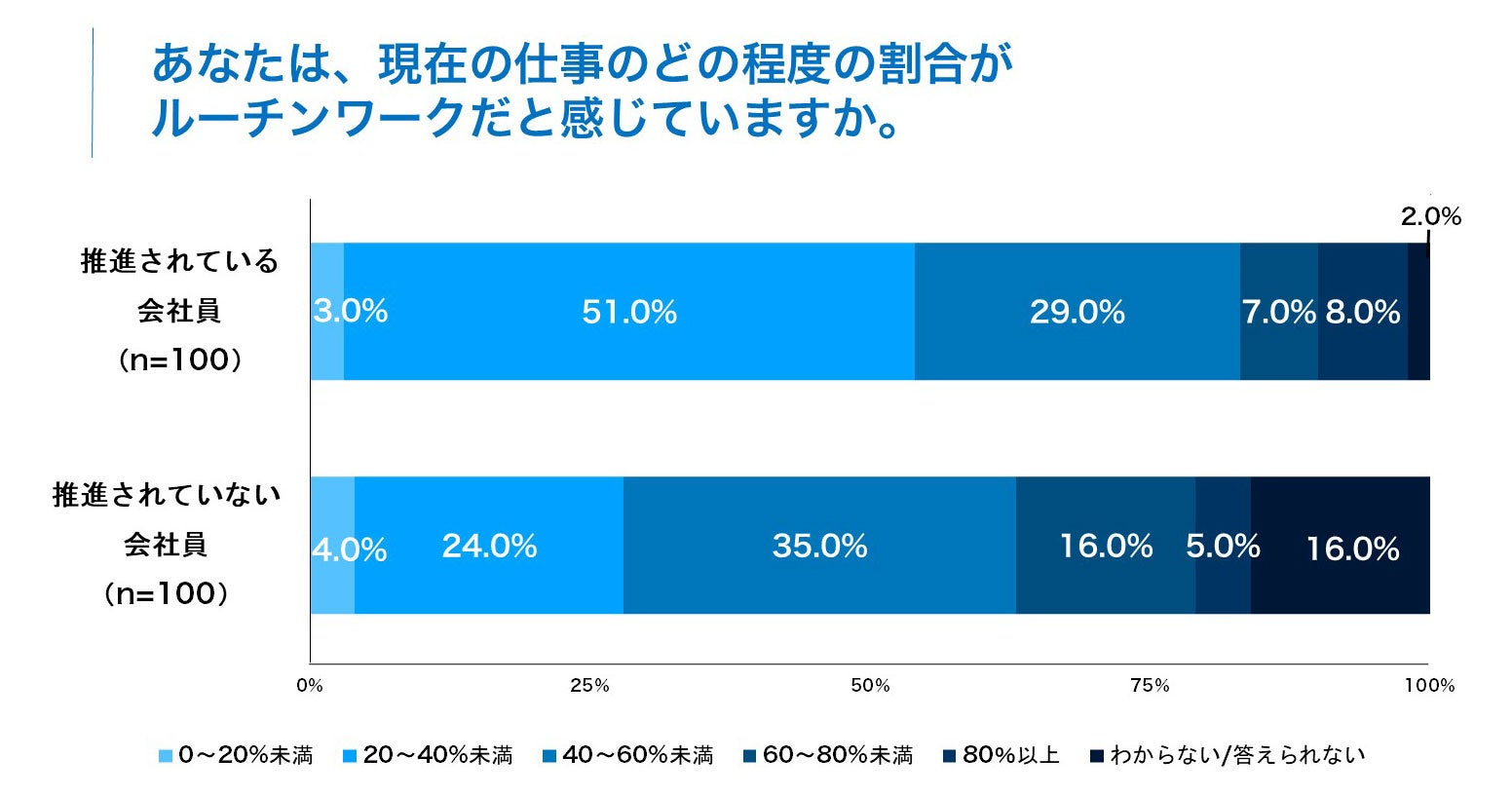 「Q5.あなたは、現在の仕事のどの程度の割合がルーチンワークだと感じていますか。」と質問したところ、推進されている会社員は「20~40%未満」が51.0%、「40~60%未満」が29.0%、推進されていない会社員は「40~60%未満」が35.0%、「20~40%未満」が24.0%という回答となりました。