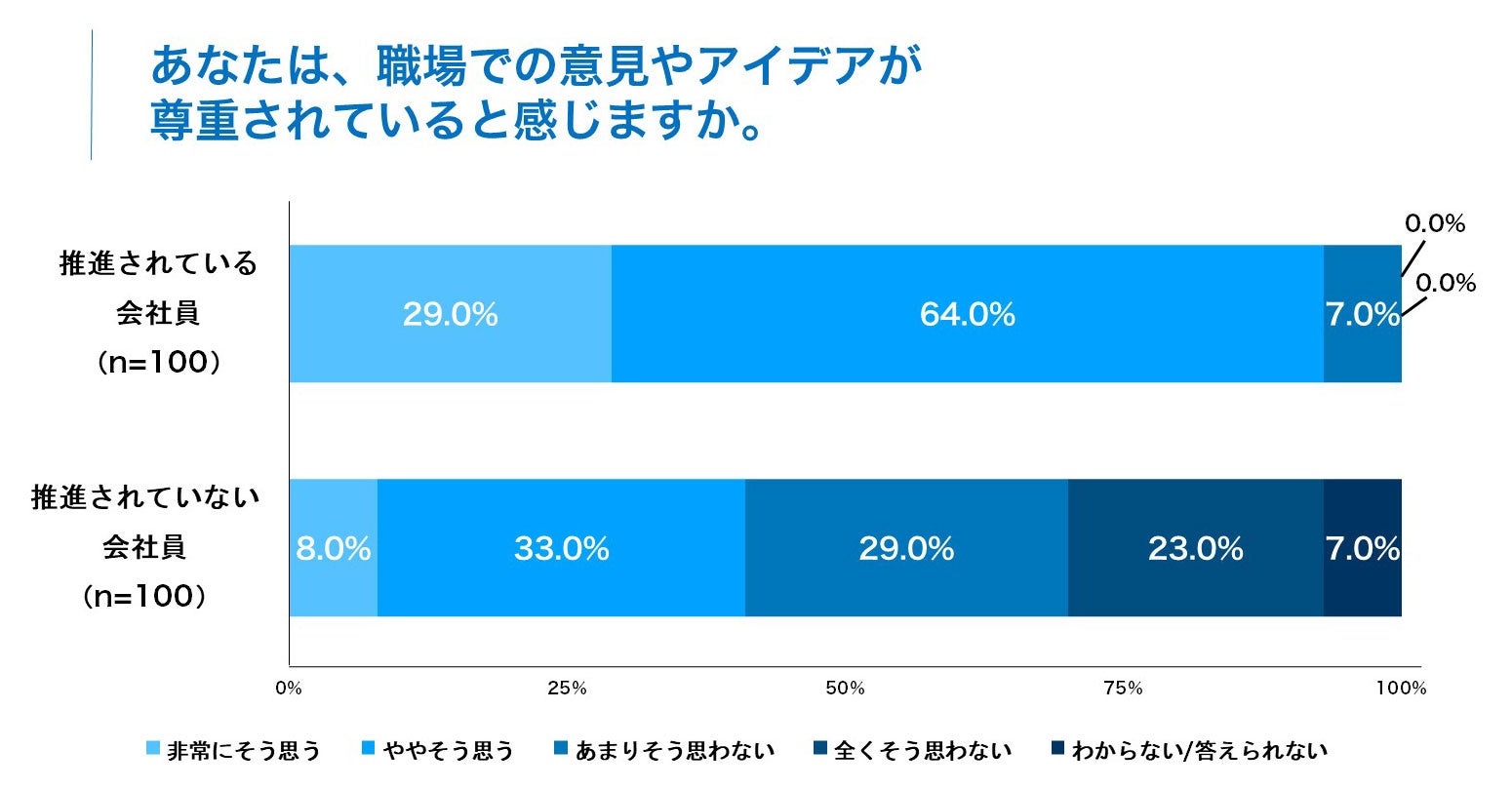 「Q4.あなたは、職場での意見やアイデアが尊重されていると感じますか。」と質問したところ、推進されている会社員は「非常にそう思う」が29.0%、「ややそう思う」が64.0%、推進されていない会社員は「非常にそう思う」が8.0%、「ややそう思う」が33.0%という回答となりました。「あまりそう思わない」が29.0%、「全くそう思わない」が23.0%で、合計52%と半数近くが「そう思わない」と回答しました。