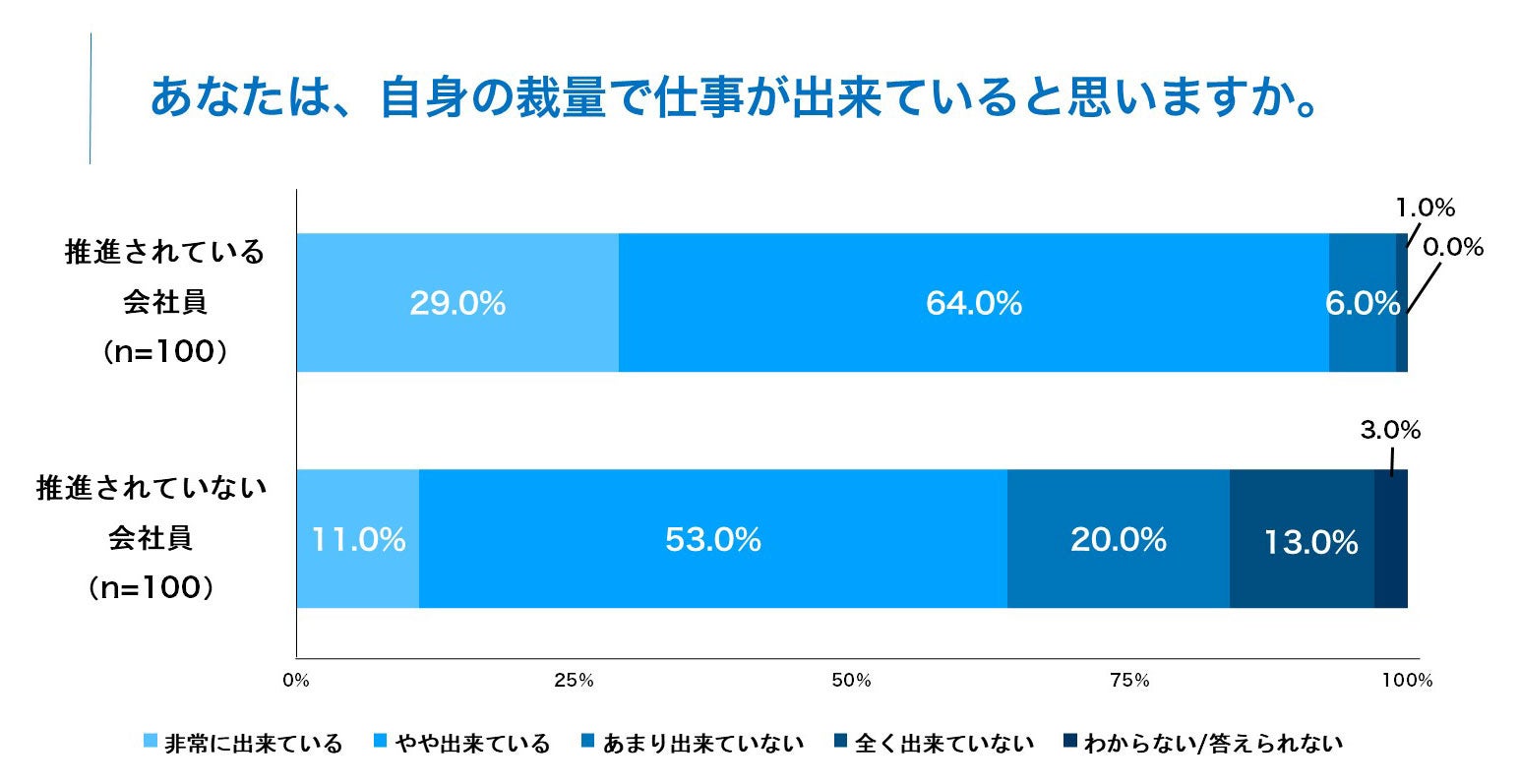 「Q7.あなたは、自身の裁量で仕事が出来ていると思いますか。」と質問したところ、進されている会社員は「非常に出来ている」が29.0%、「やや出来ている」が64.0%、推進されていない会社員は「非常に出来ている」が11.0%、「やや出来ている」が53.0%という回答となりました。