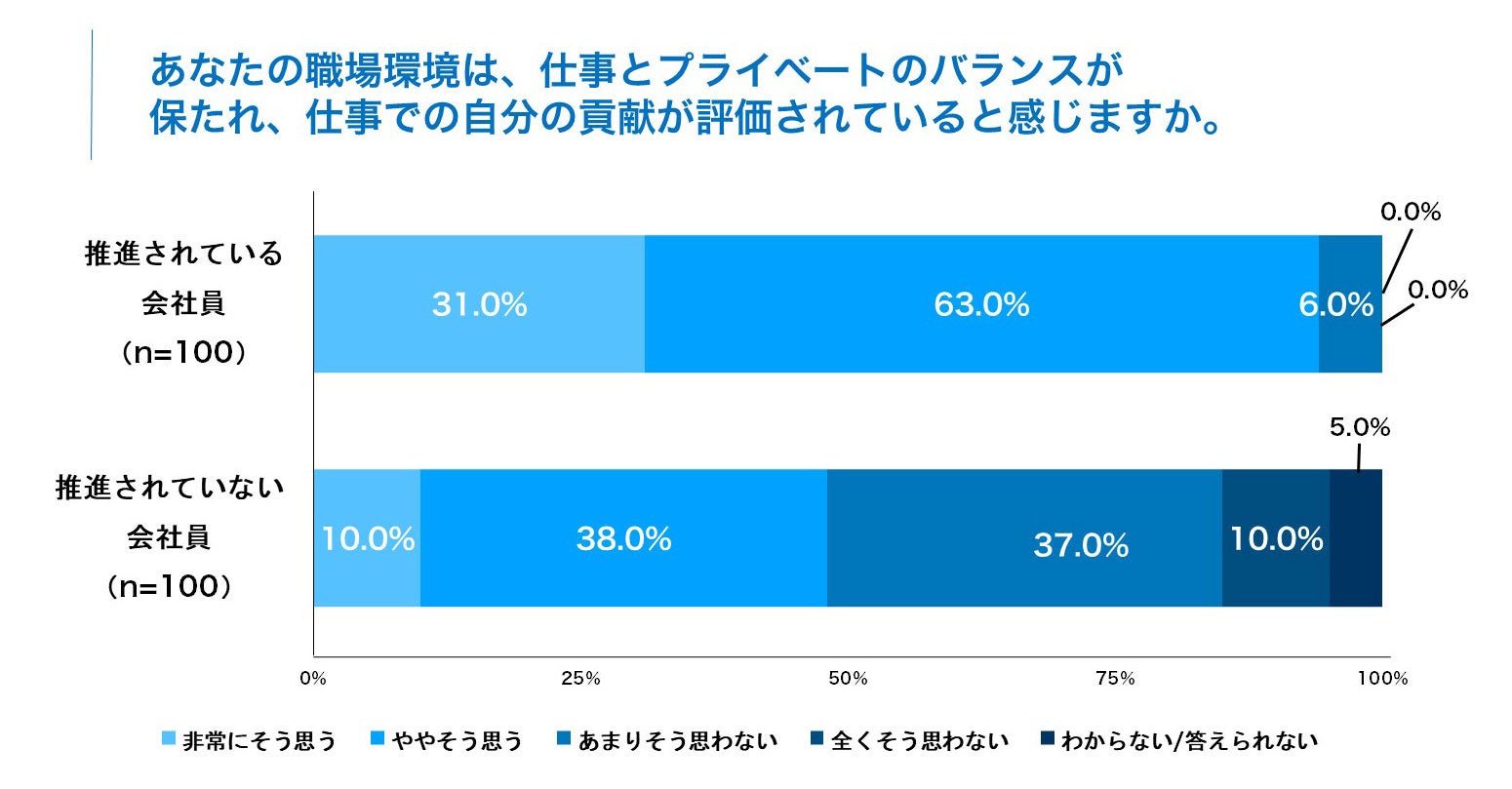 「Q6.あなたの職場環境は、仕事とプライベートのバランスが保たれ、仕事での自分の貢献が評価されていると感じますか。」と質問したところ、推進されている会社員は「非常にそう思う」が31.0%、「ややそう思う」が63.0%、推進されていない会社員は「非常にそう思う」が10.0%、「ややそう思う」が38.0%という回答となりました。「あまりそう思わない」が37.0%、「全くそう思わない」が10.0%で、合計47%と半数近くが「そう思わない」と回答しました。
