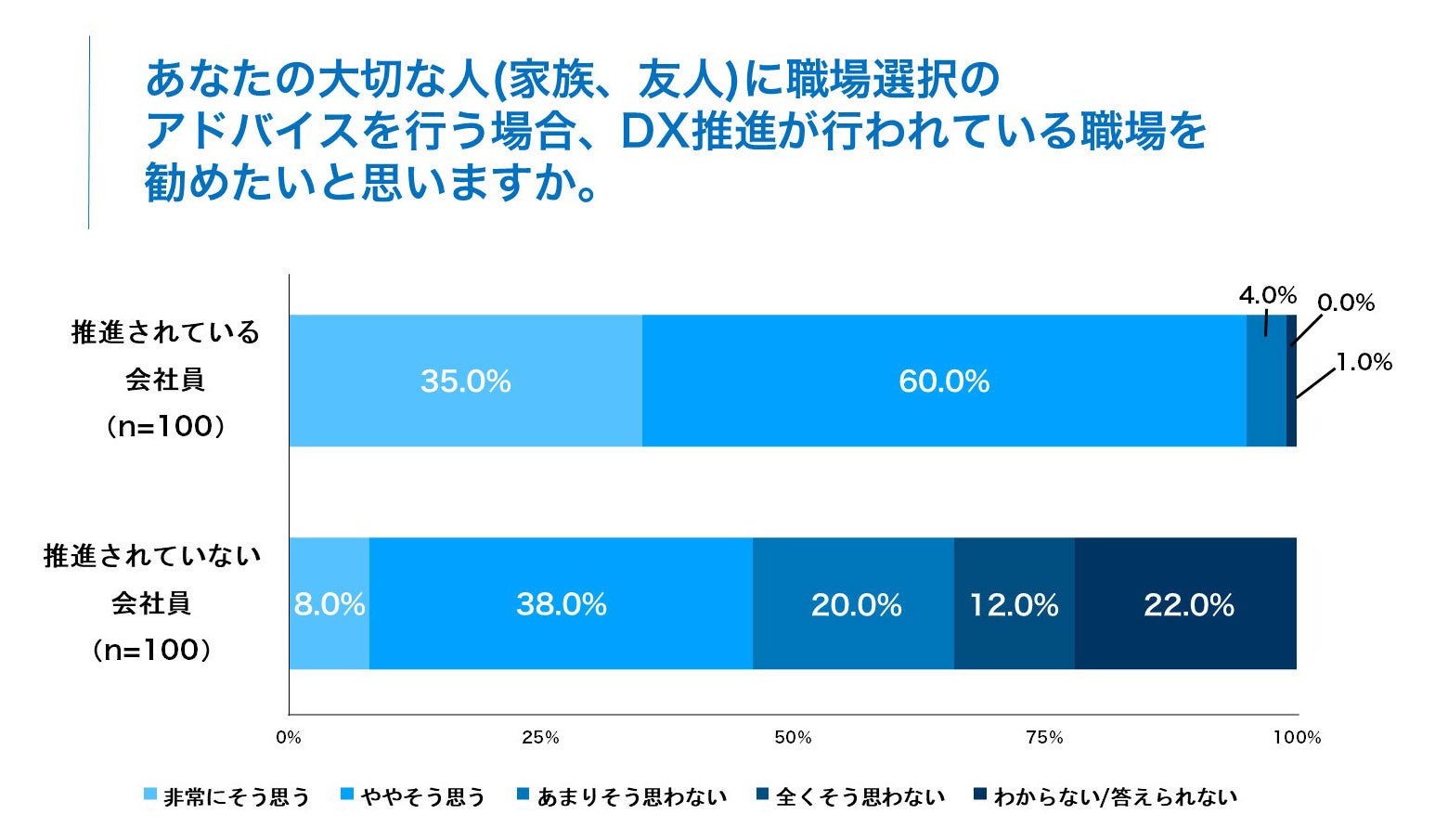 「Q9.あなたの大切な人(家族、友人)に職場選択のアドバイスを行う場合、DX推進が行われている職場を勧めたいと思いますか。」と質問したところ、推進されている会社員は「非常にそう思う」が35.0%、「ややそう思う」が60.0%、推進されていない会社員は「非常にそう思う」が8.0%、「ややそう思う」が38.0%という回答となりました。