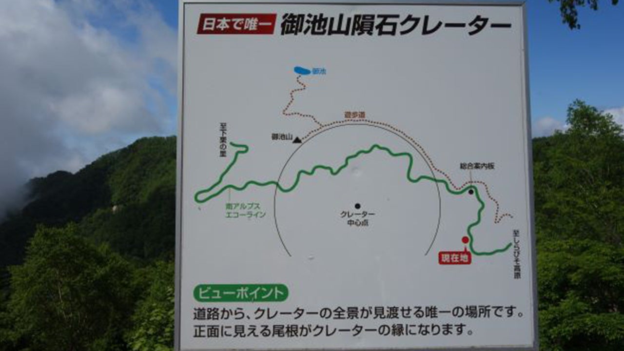 飯田市上村の南アルプス山麓にある御池山(1905メートル、市有林)の半円形の地形は隕石クレーターではないかという仮説を立て、25年以上にわたって研究を続ける。