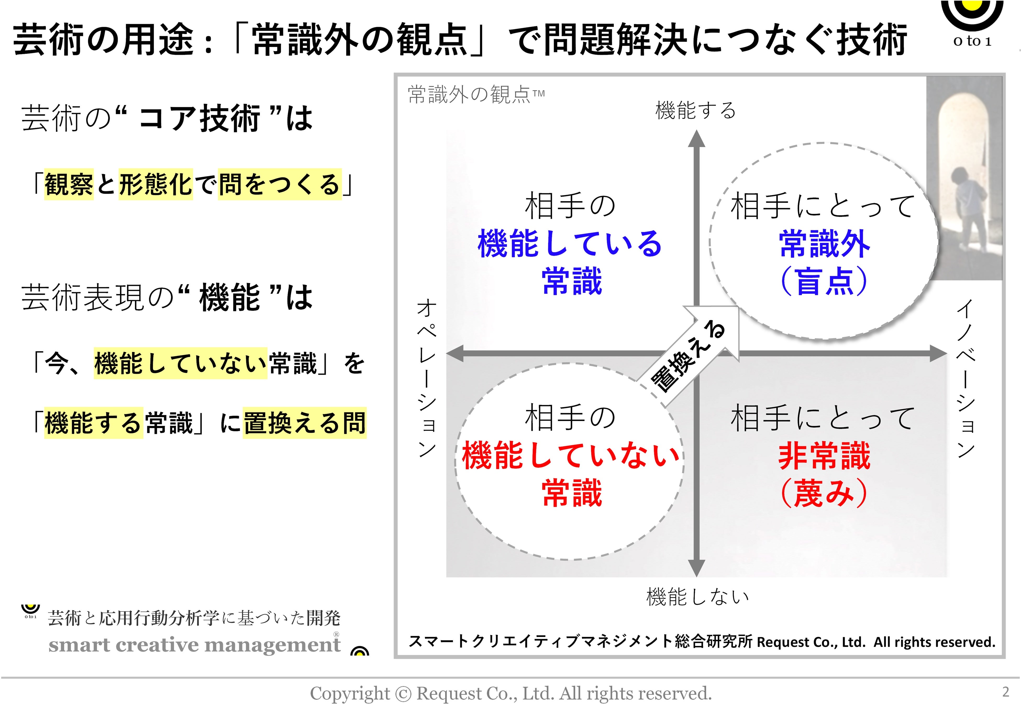 スマートクリエイティブマネジメント総合研究所 と ABA(応用行動分析学)オペレーションズ研究センター をかまえ、経済の根幹「事業戦略の具現化」を目的に、芸術と応用行動分析に基づいた開発:需要創造の科学®“ smart creative management® ”を、社員30,000人の企業から30人の地域に密着した優良企業840社以上へプログラム開発を行うリクエスト株式会社(代表取締役 甲畑智康)は、この度、芸術の定義と用途を明らかにし「問題解決の手段としての芸術」の提供を開始することになりました。