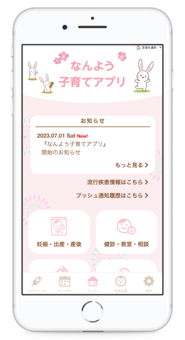 なんよう市の子どもたちの成長を地域みんなで支えていくという想いを込めて「なんよう子育てアプリ」と命名しました。トップページには、熊野大社の「三羽のうさぎ」をイメージしたうさぎのイラストが登場。南陽市らしさが詰まった、こだわりのデザインでお届けします。