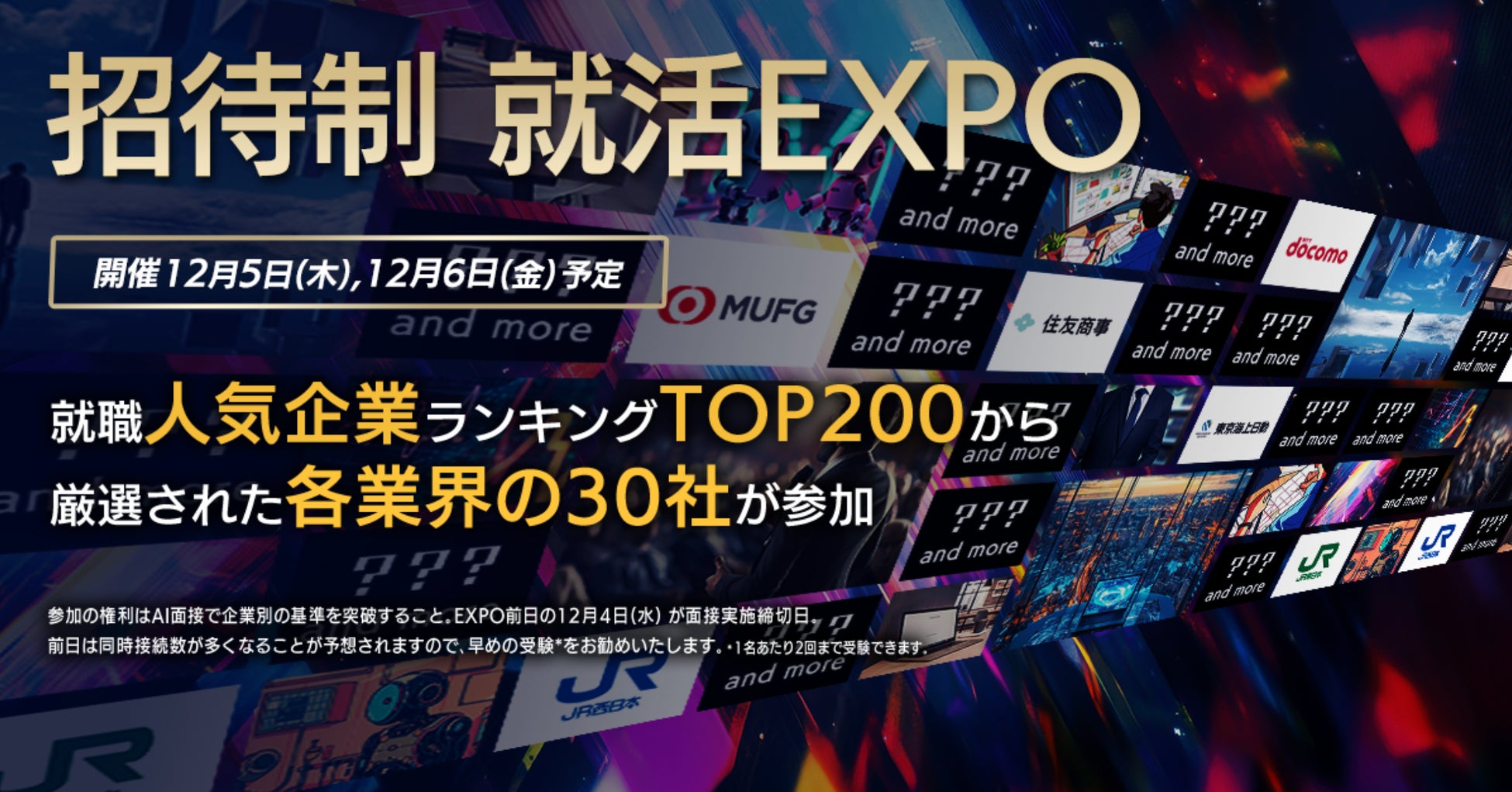 志望企業の内定判定がわかる『REALME』は、国内最大手企業が集結する選考直結型・完全招待制の説明会イベント『就活EXPO』を開催します。