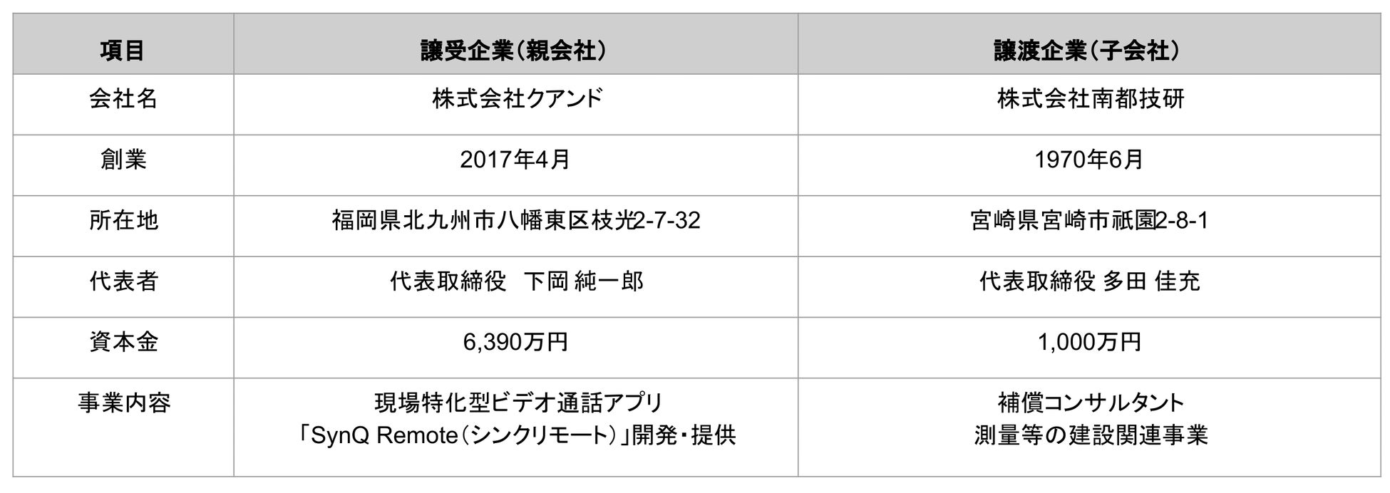建設・製造現場等の現場特化型ビデオ通話アプリ「SynQ Remote(シンクリモート)」を開発提供する株式会社クアンド(本社:福岡県北九州市、代表取締役CEO:下岡 純一郎)は、宮崎県を拠点とする測量・補償コンサルタント事業を手掛ける株式会社南都技研(本社:宮崎県宮崎市、代表取締役:多田佳充)を完全子会社化しました。クアンドが強みとするDX技術で産業全体の変革「IX(インダストリートランスフォーメーション)」を目指し、建設業の人手不足にも対応できる九州発の新しい建設業モデルに挑みます。