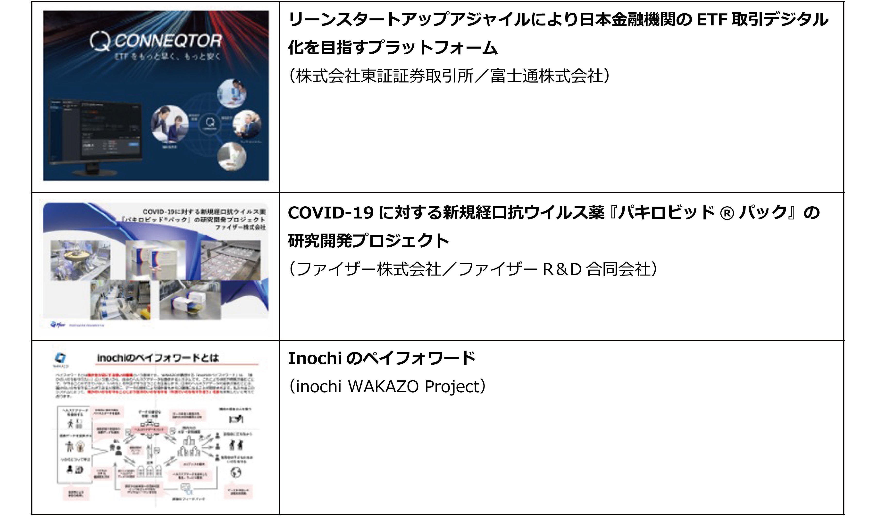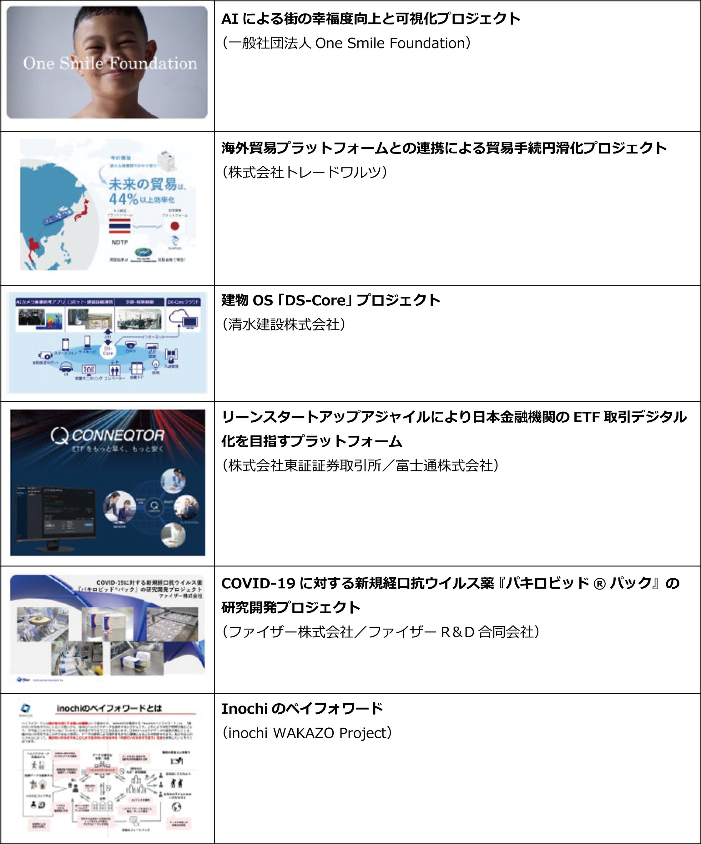 PM Award 2022では、厳正な書類審査の結果、弊社の「海外貿易プラットフォームとの連携による貿易手続円滑化プロジェクト」を含む下記6プロジェクトがファイナリストとして選出され、オンラインセミナーにて30分ずつの講演を実施しました。さらにそれを元に「新規性」「有用性」「組織の影響度」「課題への貢献度」の4つの基準で、約1,000名の一般投票により各表彰プロジェクトが選定されました。
