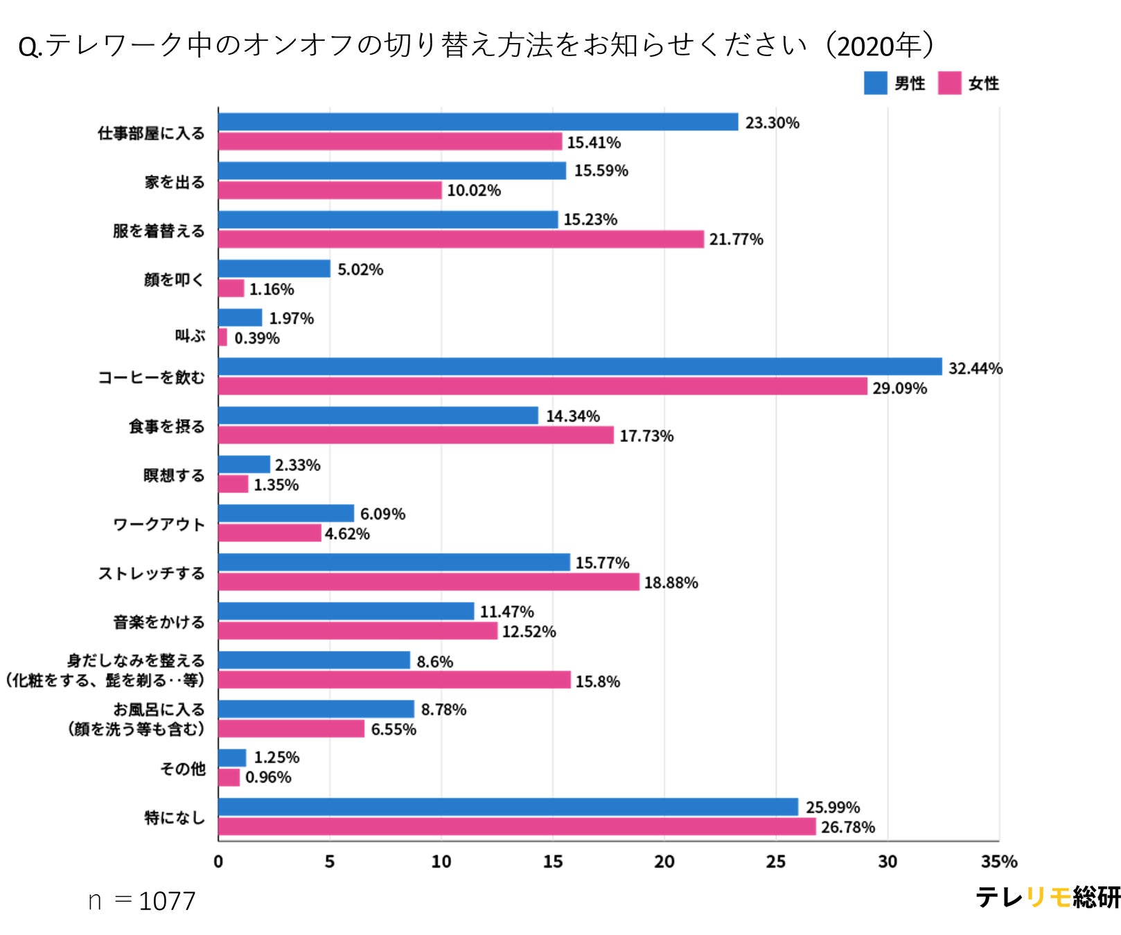 この原因のひとつとして、出社・退社の概念が薄いテレワークにおいては仕事のスイッチのオンオフを切り替えづらいということがあることが考えられます。逆に言えば、仕事のスイッチの切り替えがうまくできるようになれば、より効率よく、ストレスのないテレワークが実現できるということなのではないでしょうか。そこで、仕事のオンオフの切り替え方について以前のデータと最新のデータを比較しました。