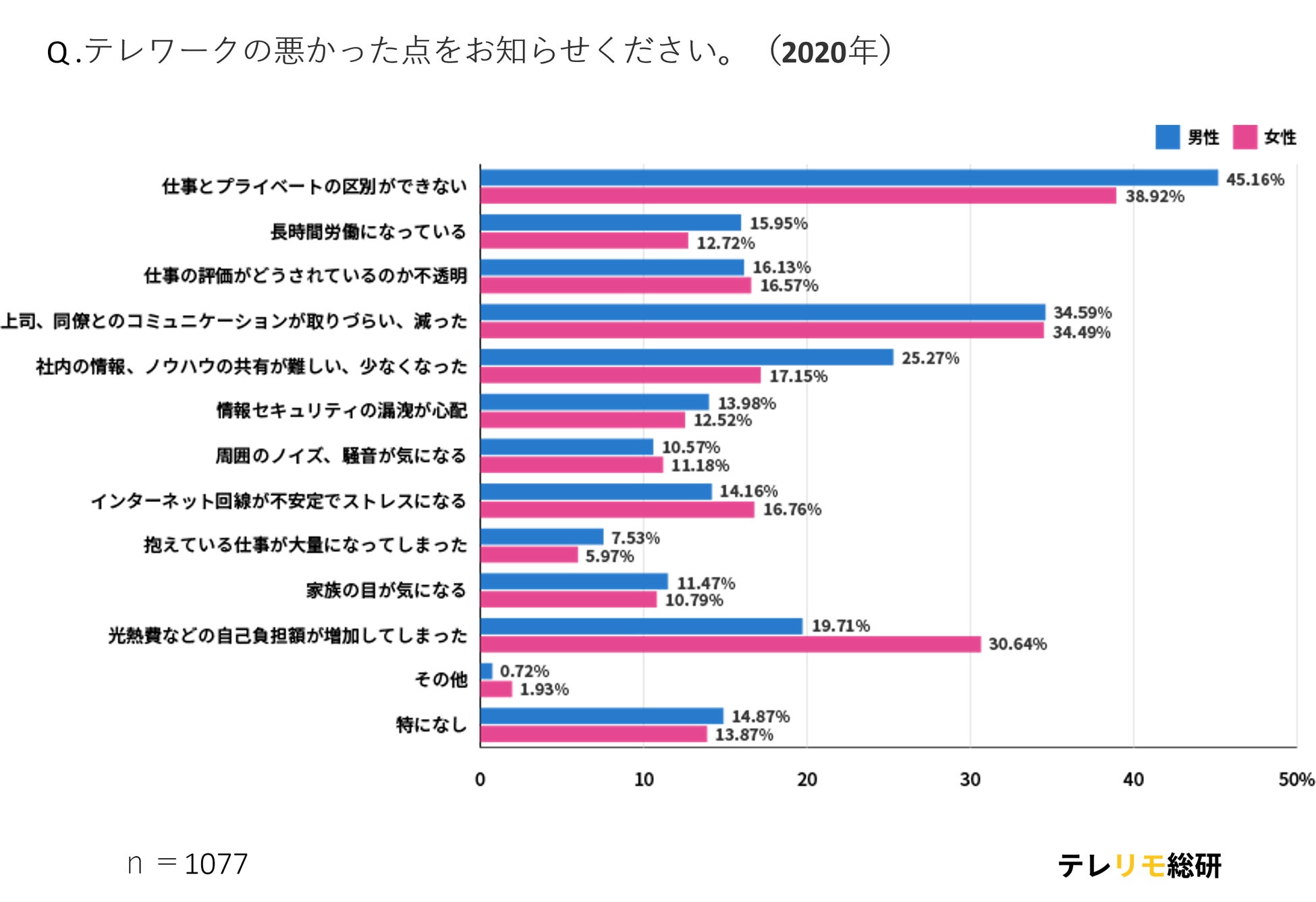 どちらの年度の調査でも、最も多かった回答は前述の通り男女ともに「仕事とプライベートの区別ができない」という結果となりました。男性の回答は45.16%→45.3%とかすかに上昇、女性のテレワーカーからは38.92%→46.1%と大幅に上昇していることがわかります。