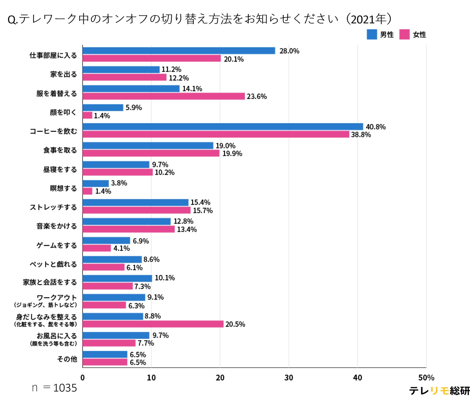 多くの回答を得たのは2020年、2021年ともに『仕事部屋』『コーヒー』『身だしなみ』の3項目でした。そして、その3項目のを選択した割合が増えていることもグラフからわかります。これらの3項目がオンオフを切り替えるためにどのように効果的なのかを考察していきます。