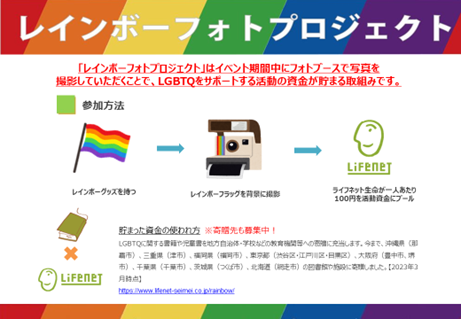 レインボーフェスタ!2023・関西レインボーパレードは、関西在住のセクシュアルマイノリティ、地域住民を中心に、日本各地、海外からも多くの方が参加するイベントです(2022年度実績:約20,000人・2日間開催)。本イベントのライフネット生命のブースでは、「レインボーフォトプロジェクト」を実施します。本プロジェクトは、ブース内で写真撮影をしていただいたお客さま一人あたり100円を当社が積み立て、その資金を元にLGBTQに関する児童書を購入し、購入した書籍を全国各地の図書館や学校に寄贈する活動です。今回はライフネット生命がオリジナルで作成したレインボー柄のうちわを配布し、多くの方に当社の取組みをお伝えします。