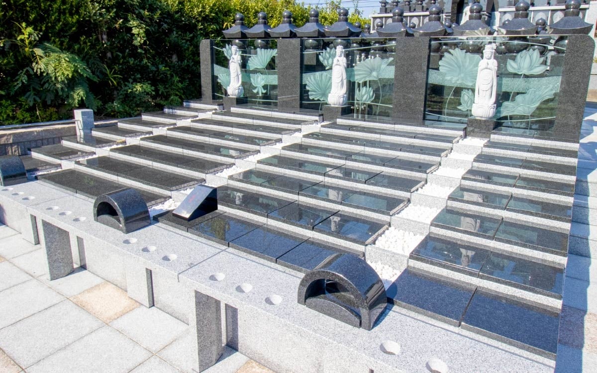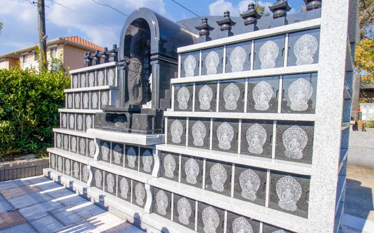 観音様が中央で見守り、縦型に区画が並んでいるタイプです。触れられる距離でお参りすることができるため、故人様を近くに感じる事ができます。