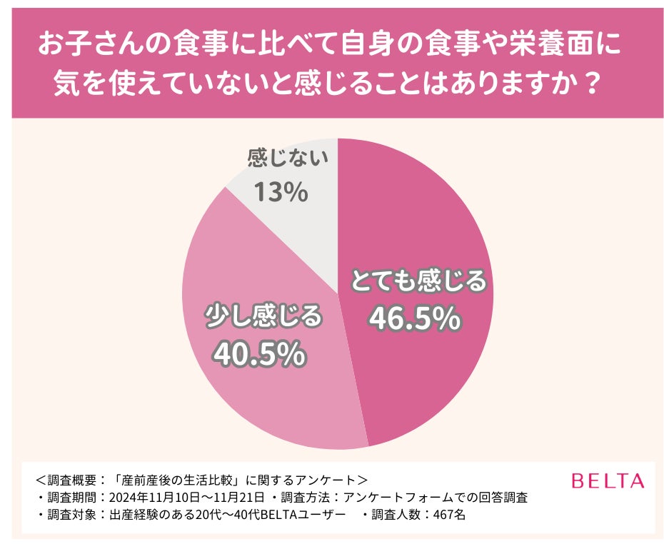 出産後、子どもと比べて、自分の食事や栄養面に気を使えていないと感じている人は全体の87%にのぼりました。