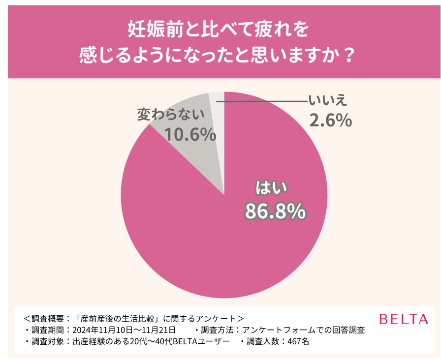 産後「妊娠前と比べて疲れを感じるようになった」感じている人は86.8%