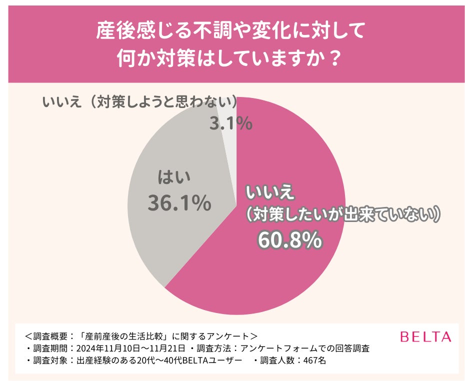産後感じる不調や変化に対して『対策をしている』と回答した人は全体の36.1%、『対策をしたいと思いながら出来ていない』と回答した人は全体の60.8%いました。