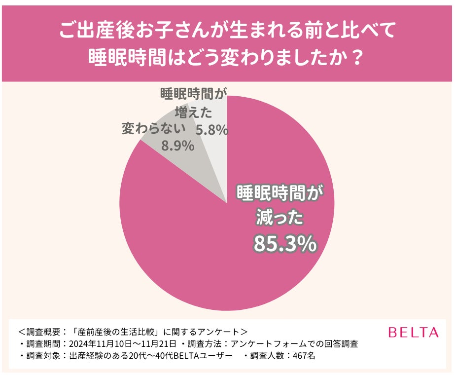 産前と比べ「産後のほうが睡眠時間が減った」と感じている人は85.3%