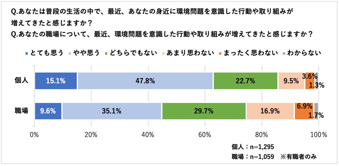 ・職場において環境問題を意識した行動や取り組みが増えてきたと感じている人は44.7%、個人の生活においてそれらの増加を感じている人は62.9%。職場より個人の方が2割程度高い。