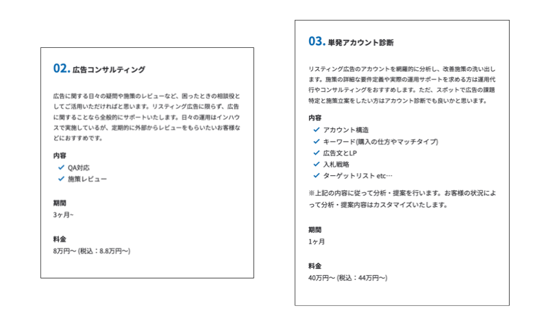 リスティング広告のアカウントを網羅的に分析し、改善施策の洗い出します。施策の詳細な要件定義や実際の運用サポートを求める方は運用代行やコンサルティングをおすすめします。ただ、スポットで広告の課題特定と施策立案をしたい方はアカウント診断でも良いかと思います。