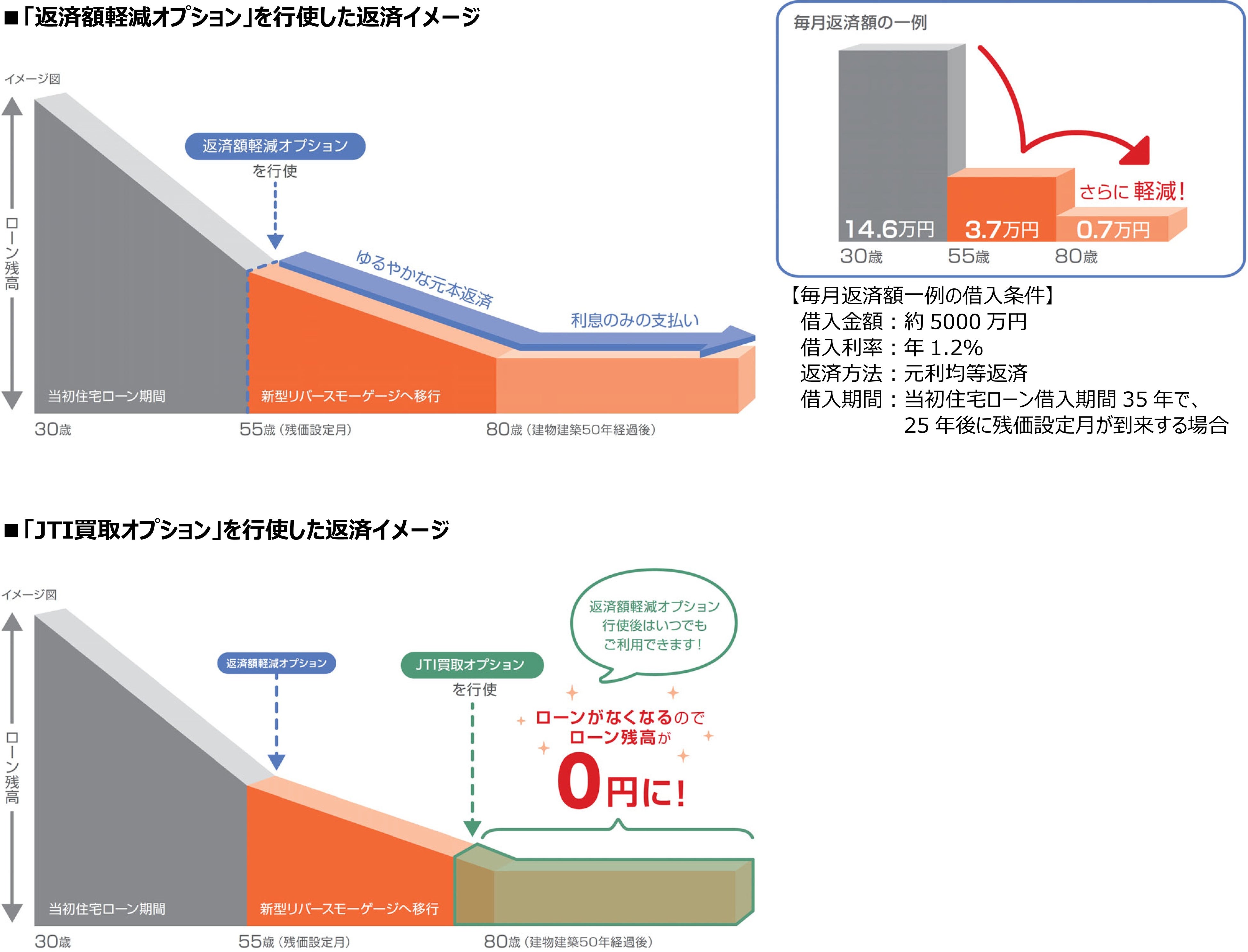 この度取扱いを開始する残価設定型住宅ローンは、JTIが設定する残価設定月※3以降、「返済額軽減オプション」を行使することで、新型リバースモーゲージ型(※4)住宅ローンへ移行し、毎月の返済額を軽減することができます。また、「返済額軽減オプション」を行使後、「JTI買取オプション」を行使することで、その時点での住宅ローン残高と同額で、JTI等※5が対象の土地・建物を引き受けます※6。当住宅ローンの借入期間は、固定金利だけでなく、多くのお客さまが利用される変動金利も選択できます※7。加えて融資条件の変更でオプションを利用できるため、借り換えや借り換えに必要な登記費用が不要。また、オプション利用後も70歳まで団体信用生命保険に加入することができます。