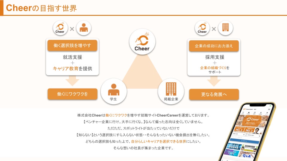 CheerCareer登録ユーザーは『ベンチャー・成長企業を選択肢に持っている』母集団が集まっておりますが、そうした学生層は市場全体では限られた規模となっており、なかなか"一般的な採用手法"だけではクロージング・魅力づけが難しくなってしまうことがあります。