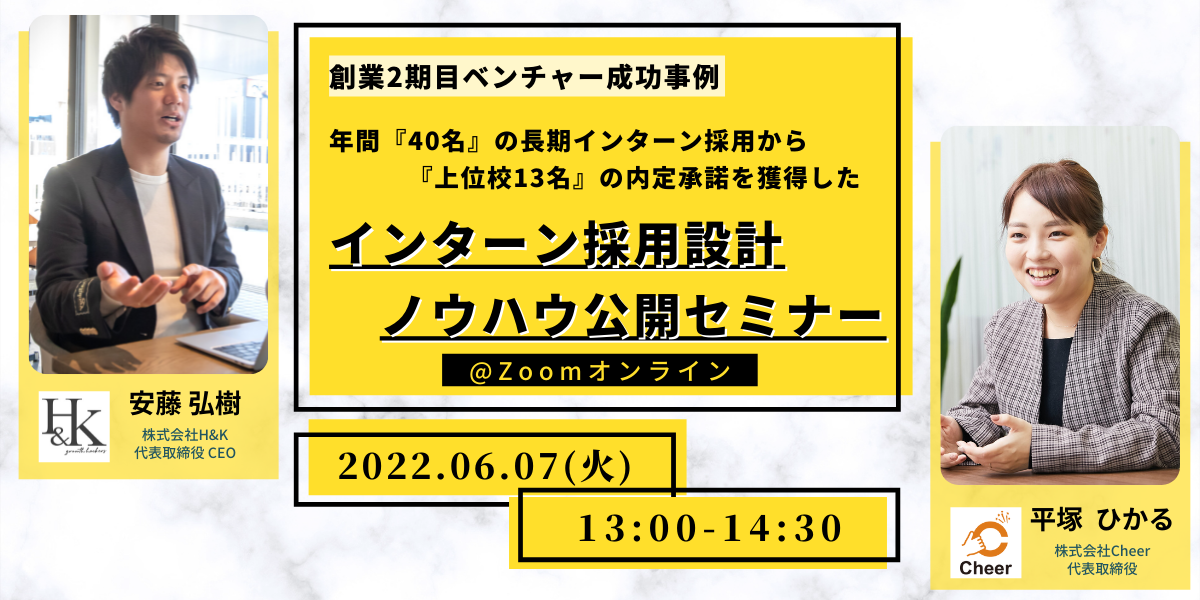 【6月7日(火)|H&K×CheerCareerの共催セミナー開催】年間「40名」の長期インターン採用から「上位校学生13名」の内定承諾を獲得した『インターン採用設計ノウハウ公開セミナー』