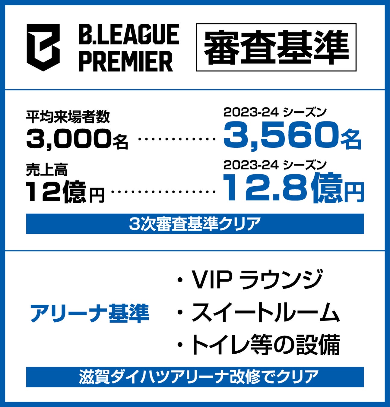 滋賀レイクスは、多くのパートナー企業、ファン・ブースター、県内地方自治体、その他滋賀県民・関係者の皆様のご支援により、2023-24シーズン実績で主な審査基準のうち、3次審査の基準となる「平均来場者数 3,000名(実績:3,688名)」「売上高12億円(実績:12.8億円)」を達成。「アリーナ基準」においても、民間資本でホームアリーナの滋賀ダイハツアリーナを審査基準を満たす仕様に改修する計画を施設所有者である滋賀県より許諾をいただけたことで、審査基準を充足することができました。