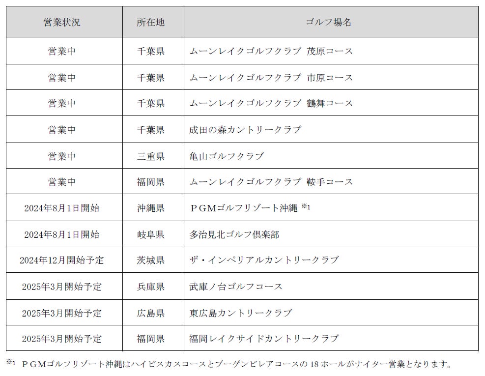 なお、今後、ザ・インペリアルカントリークラブ(茨城県稲敷市)、武庫ノ台ゴルフコース(兵庫県神戸市)、東広島カントリークラブ(広島県東広島市)、福岡レイクサイドカントリークラブ(福岡県飯塚市)の4コースでナイター営業の開始に向けた準備を進めてまいります。